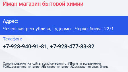 Иман, магазин бытовой химии по адресу Чеченская республика, Гудермес, Черкесбиева, 22/1 в дальнейшем Организация, размещена в следующих категориях: