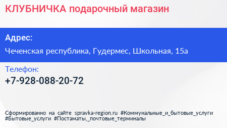 КЛУБНИЧКА, подарочный магазин по адресу Чеченская республика, Гудермес, Школьная, 15а в дальнейшем Организация, размещена в следующих категориях: