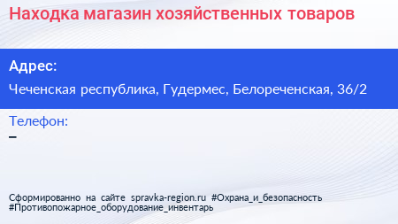 Находка, магазин хозяйственных товаров по адресу Чеченская республика, Гудермес, Белореченская, 36/2 в дальнейшем Организация, размещена в следующих категориях: