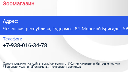 Зоомагазин по адресу Чеченская республика, Гудермес, 84 Морской Бригады, 59 в дальнейшем Организация, размещена в следующих категориях: