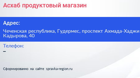 Асхаб, продуктовый магазин по адресу Чеченская республика, Гудермес, проспект Ахмада-Хаджи Кадырова, 40 в дальнейшем Организация, размещена в следующих категориях: