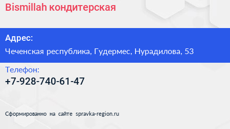 Bismillah, кондитерская по адресу Чеченская республика, Гудермес, Нурадилова, 53 в дальнейшем Организация, размещена в следующих категориях: