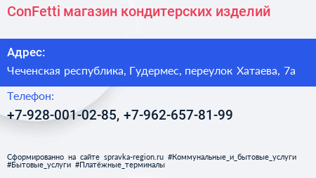 ConFetti, магазин кондитерских изделий по адресу Чеченская республика, Гудермес, переулок Хатаева, 7а в дальнейшем Организация, размещена в следующих категориях: