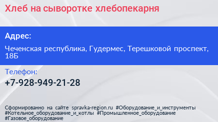 Хлеб на сыворотке, хлебопекарня по адресу Чеченская республика, Гудермес, Терешковой проспект, 18Б в дальнейшем Организация, размещена в следующих категориях: