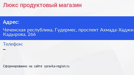Люкс, продуктовый магазин по адресу Чеченская республика, Гудермес, проспект Ахмада-Хаджи Кадырова, 266 в дальнейшем Организация, размещена в следующих категориях: