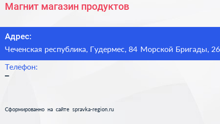 Магнит, магазин продуктов по адресу Чеченская республика, Гудермес, 84 Морской Бригады, 26 в дальнейшем Организация, размещена в следующих категориях: