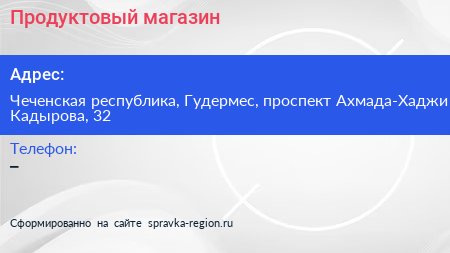 Продуктовый магазин по адресу Чеченская республика, Гудермес, проспект Ахмада-Хаджи Кадырова, 32 в дальнейшем Организация, размещена в следующих категориях: