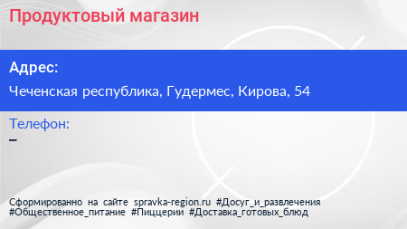 Продуктовый магазин по адресу Чеченская республика, Гудермес, Кирова, 54 в дальнейшем Организация, размещена в следующих категориях:
