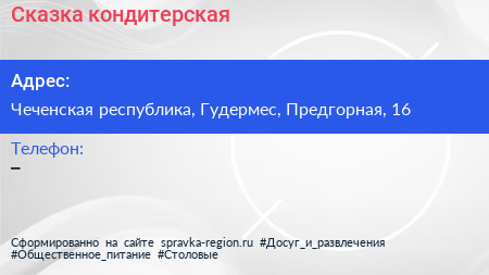 Сказка, кондитерская по адресу Чеченская республика, Гудермес, Предгорная, 16 в дальнейшем Организация, размещена в следующих категориях: