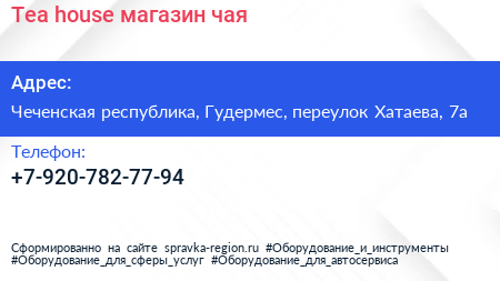 Tea house, магазин чая по адресу Чеченская республика, Гудермес, переулок Хатаева, 7а в дальнейшем Организация, размещена в следующих категориях: