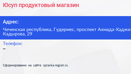 Юсуп, продуктовый магазин по адресу Чеченская республика, Гудермес, проспект Ахмада-Хаджи Кадырова, 29 в дальнейшем Организация, размещена в следующих категориях: