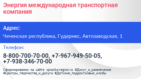 Энергия, международная транспортная компания по адресу Чеченская республика, Гудермес, Автозаводская, 1 в дальнейшем Организация, размещена в следующих категориях: