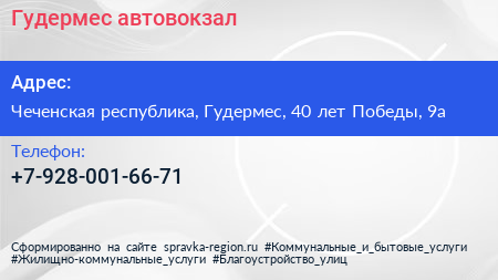 Гудермес, автовокзал по адресу Чеченская республика, Гудермес, 40 лет Победы, 9а в дальнейшем Организация, размещена в следующих категориях: