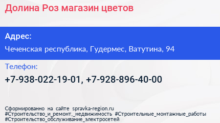 Долина Роз, магазин цветов по адресу Чеченская республика, Гудермес, Ватутина, 94 в дальнейшем Организация, размещена в следующих категориях: