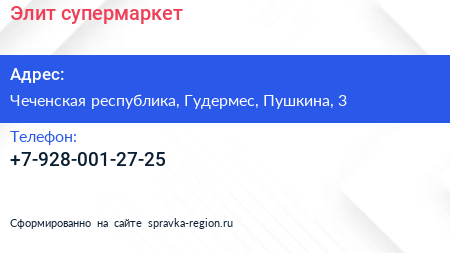 Элит, супермаркет по адресу Чеченская республика, Гудермес, Пушкина, 3 в дальнейшем Организация, размещена в следующих категориях: