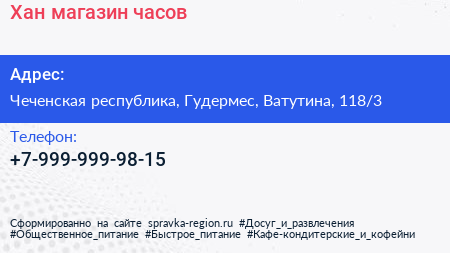 Хан, магазин часов по адресу Чеченская республика, Гудермес, Ватутина, 118/3 в дальнейшем Организация, размещена в следующих категориях: