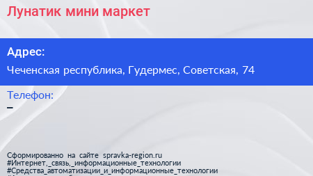 Лунатик, мини-маркет по адресу Чеченская республика, Гудермес, Советская, 74 в дальнейшем Организация, размещена в следующих категориях: