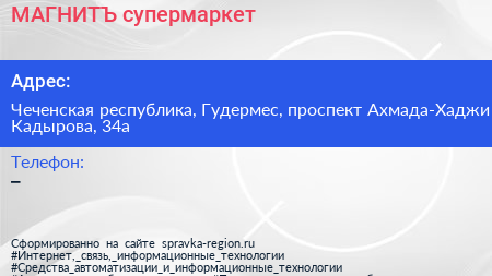 МАГНИТЪ, супермаркет по адресу Чеченская республика, Гудермес, проспект Ахмада-Хаджи Кадырова, 34а в дальнейшем Организация, размещена в следующих категориях: