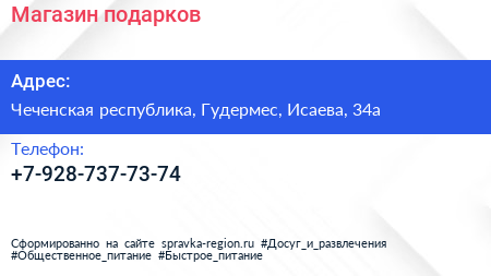 Магазин подарков по адресу Чеченская республика, Гудермес, Исаева, 34а в дальнейшем Организация, размещена в следующих категориях: