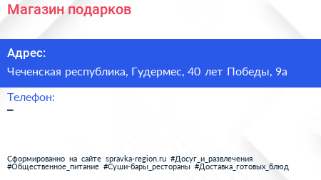 Магазин подарков по адресу Чеченская республика, Гудермес, 40 лет Победы, 9а в дальнейшем Организация, размещена в следующих категориях: