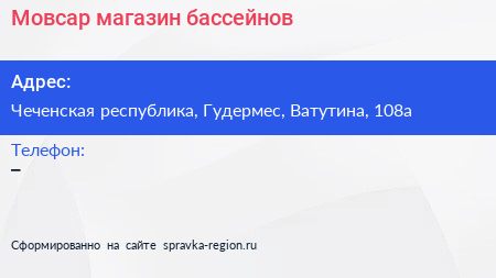 Мовсар, магазин бассейнов по адресу Чеченская республика, Гудермес, Ватутина, 108а в дальнейшем Организация, размещена в следующих категориях: