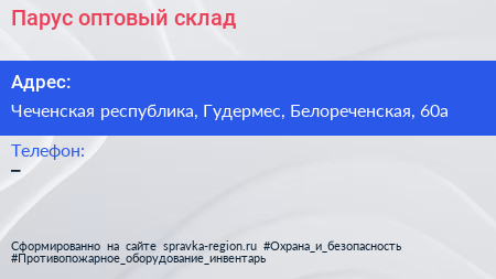 Парус, оптовый склад по адресу Чеченская республика, Гудермес, Белореченская, 60а в дальнейшем Организация, размещена в следующих категориях: