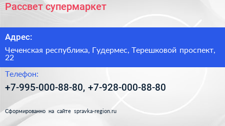 Рассвет, супермаркет по адресу Чеченская республика, Гудермес, Терешковой проспект, 22 в дальнейшем Организация, размещена в следующих категориях: