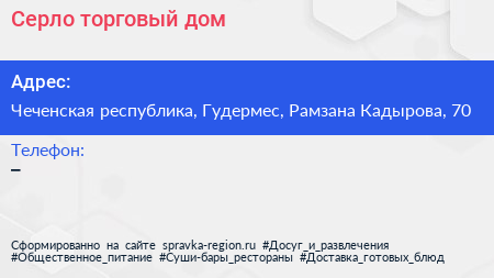 Серло, торговый дом по адресу Чеченская республика, Гудермес, Рамзана Кадырова, 70 в дальнейшем Организация, размещена в следующих категориях: