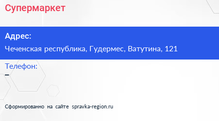 Супермаркет по адресу Чеченская республика, Гудермес, Ватутина, 121 в дальнейшем Организация, размещена в следующих категориях: