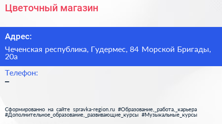 Цветочный магазин по адресу Чеченская республика, Гудермес, 84 Морской Бригады, 20а в дальнейшем Организация, размещена в следующих категориях: