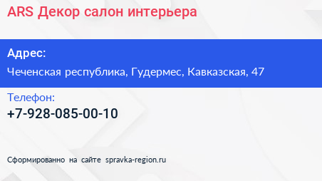 ARS Декор, салон интерьера по адресу Чеченская республика, Гудермес, Кавказская, 47 в дальнейшем Организация, размещена в следующих категориях: