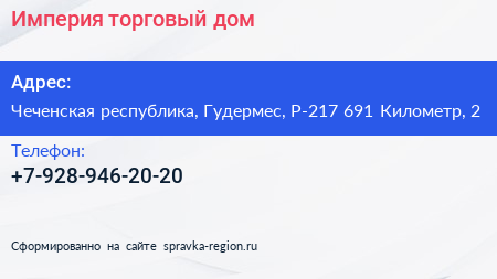 Империя, торговый дом по адресу Чеченская республика, Гудермес, Р-217 691 Километр, 2 в дальнейшем Организация, размещена в следующих категориях: