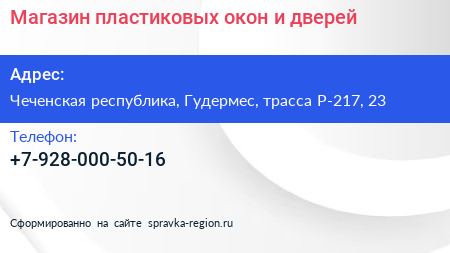 Магазин пластиковых окон и дверей по адресу Чеченская республика, Гудермес, трасса Р-217, 23 в дальнейшем Организация, размещена в следующих категориях: