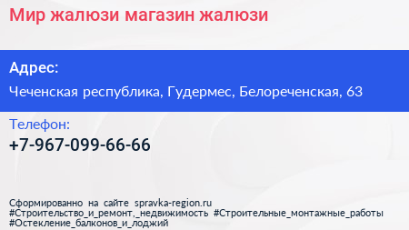 Мир жалюзи, магазин жалюзи по адресу Чеченская республика, Гудермес, Белореченская, 63 в дальнейшем Организация, размещена в следующих категориях: