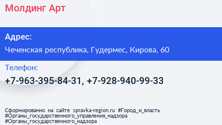 Молдинг Арт по адресу Чеченская республика, Гудермес, Кирова, 60 в дальнейшем Организация, размещена в следующих категориях: