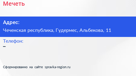 Мечеть по адресу Чеченская республика, Гудермес, Альбекова, 11 в дальнейшем Организация, размещена в следующих категориях: