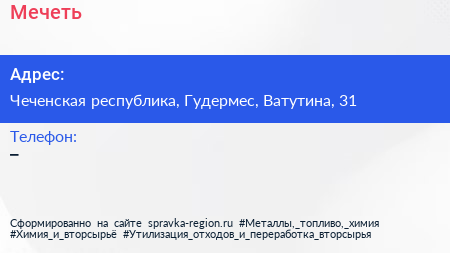 Мечеть по адресу Чеченская республика, Гудермес, Ватутина, 31 в дальнейшем Организация, размещена в следующих категориях: