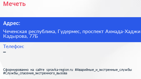 Мечеть по адресу Чеченская республика, Гудермес, проспект Ахмада-Хаджи Кадырова, 77Б в дальнейшем Организация, размещена в следующих категориях: