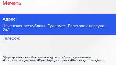 Мечеть по адресу Чеченская республика, Гудермес, Береговой переулок, 2а/1 в дальнейшем Организация, размещена в следующих категориях: