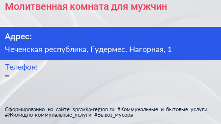Молитвенная комната для мужчин по адресу Чеченская республика, Гудермес, Нагорная, 1 в дальнейшем Организация, размещена в следующих категориях: