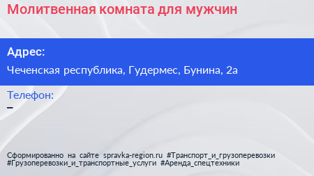 Молитвенная комната для мужчин по адресу Чеченская республика, Гудермес, Бунина, 2а в дальнейшем Организация, размещена в следующих категориях: