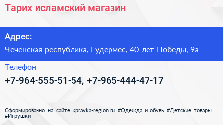 Тарих, исламский магазин по адресу Чеченская республика, Гудермес, 40 лет Победы, 9а в дальнейшем Организация, размещена в следующих категориях: