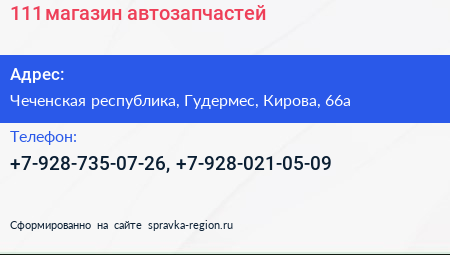 111, магазин автозапчастей по адресу Чеченская республика, Гудермес, Кирова, 66а в дальнейшем Организация, размещена в следующих категориях: