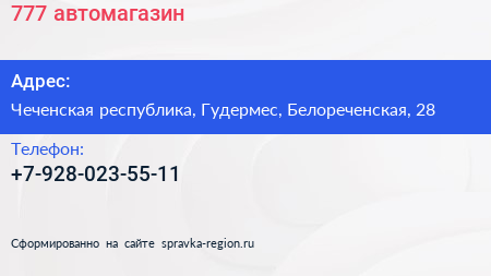 777, автомагазин по адресу Чеченская республика, Гудермес, Белореченская, 28 в дальнейшем Организация, размещена в следующих категориях: