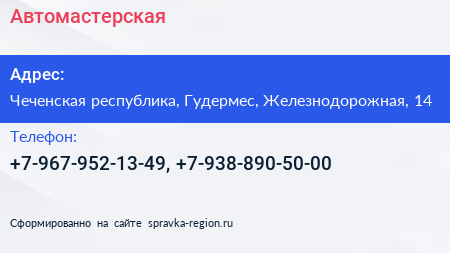 Автомастерская по адресу Чеченская республика, Гудермес, Железнодорожная, 14 в дальнейшем Организация, размещена в следующих категориях: