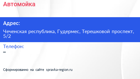 Автомойка по адресу Чеченская республика, Гудермес, Терешковой проспект, 5/2 в дальнейшем Организация, размещена в следующих категориях: