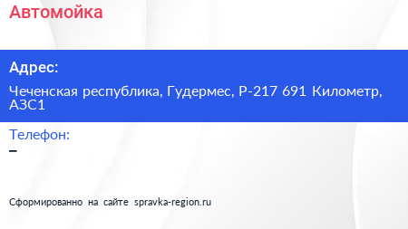 Автомойка по адресу Чеченская республика, Гудермес, Р-217 691 Километр, АЗС1 в дальнейшем Организация, размещена в следующих категориях: