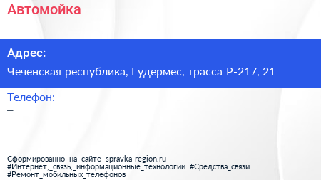 Автомойка по адресу Чеченская республика, Гудермес, трасса Р-217, 21 в дальнейшем Организация, размещена в следующих категориях: