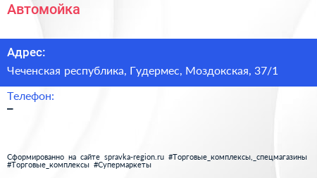Автомойка по адресу Чеченская республика, Гудермес, Моздокская, 37/1 в дальнейшем Организация, размещена в следующих категориях: