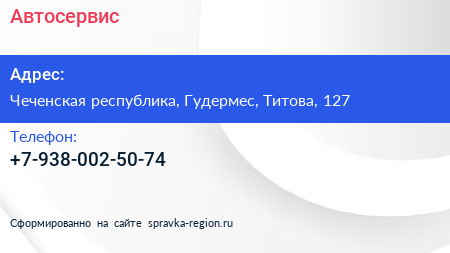 Автосервис по адресу Чеченская республика, Гудермес, Титова, 127 в дальнейшем Организация, размещена в следующих категориях: